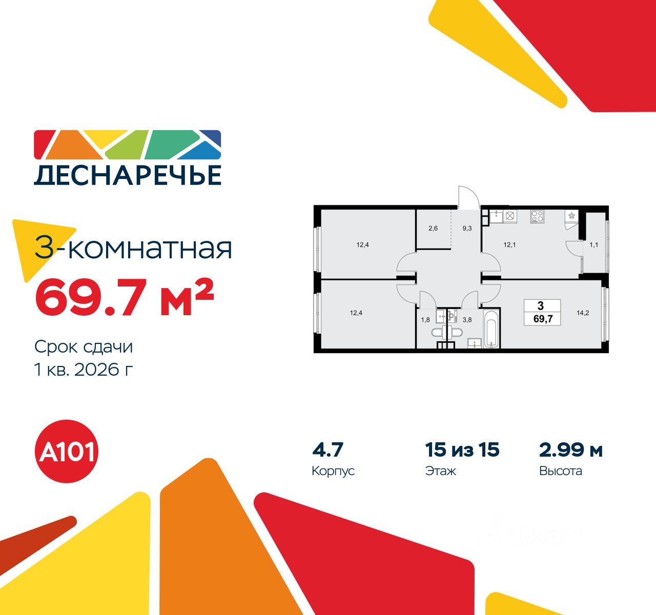 Продается трехкомнатная квартира 1606 в новостройке ЖК "Деснаречье" по адресу Москва, ТиНАО, Новомосковский АО, Десеновское С/П, Десна деревня, Москва, район Троицк, ЖК Деснаречье, к. 4.7. Общая площадь квартиры - 69.70 кв. м., этаж 15 из 15, секция 20. Тип проекта, по которому построен дом - монолит, компания-застройщик - ООО "А101". Стоимость квартиры - 24932387 Р. Срок сдачи - 1 квартал 2026.