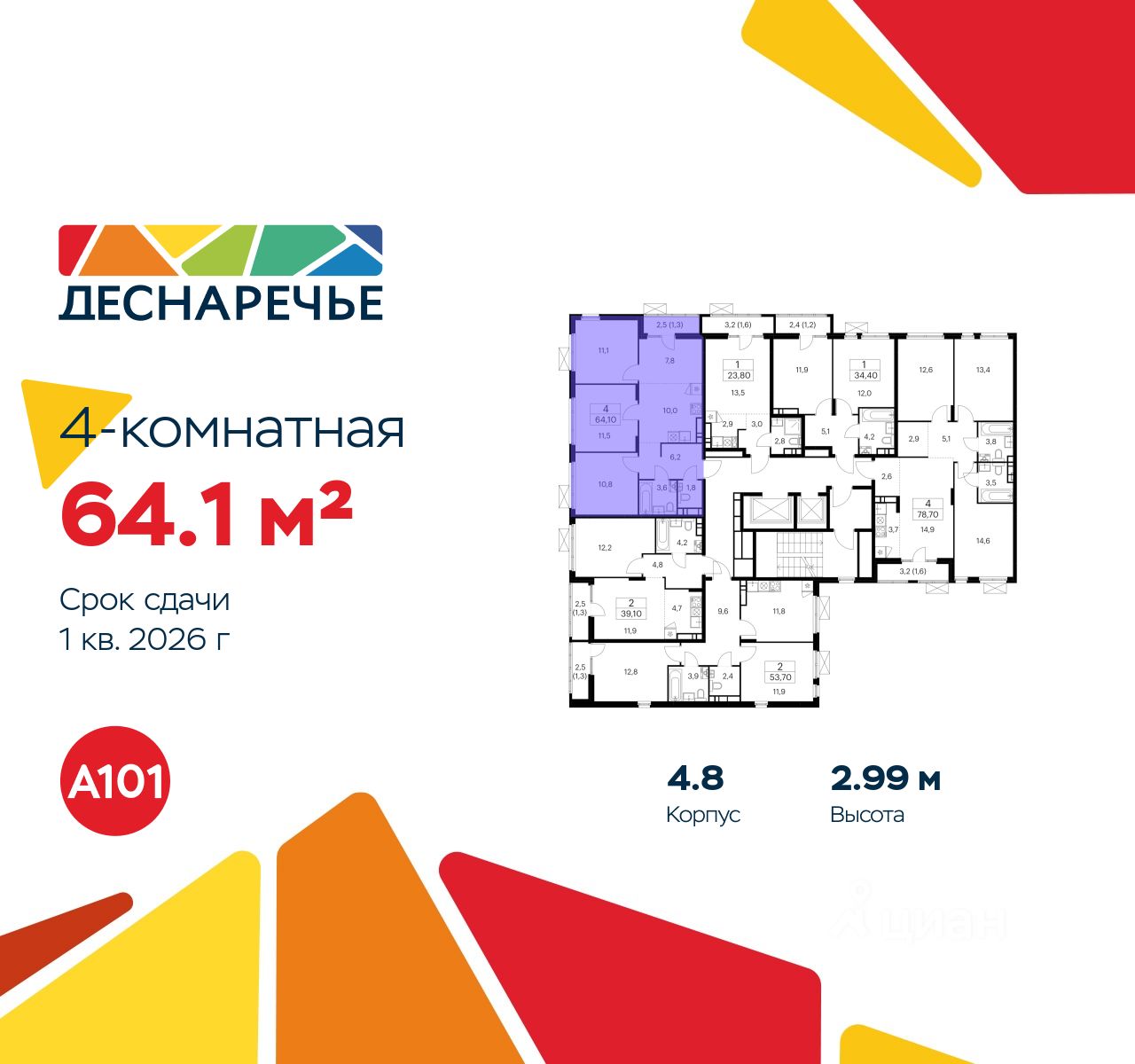 Продается четырехкомнатная квартира 1941 в новостройке ЖК "Деснаречье" по адресу Москва, ТиНАО, Новомосковский АО, Десеновское С/П, Десна деревня, Москва, район Троицк, ЖК Деснаречье, к. 4.8. Общая площадь квартиры - 64.10 кв. м., этаж 10 из 12, секция 25. Тип проекта, по которому построен дом - монолит, компания-застройщик - ООО "А101". Стоимость квартиры - 24778496 Р. Срок сдачи - 1 квартал 2026.
