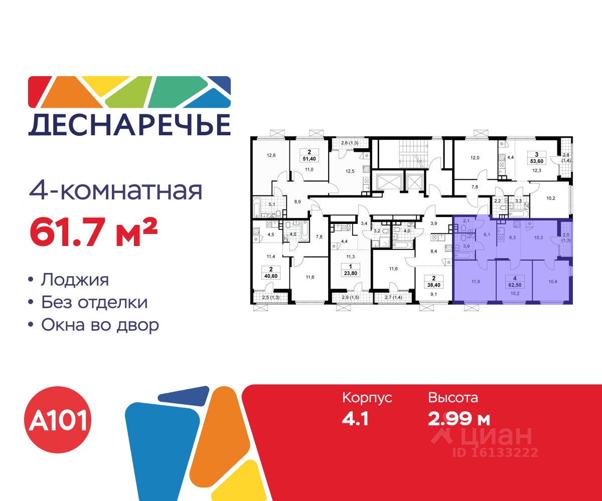 Продается четырехкомнатная квартира 262 в новостройке ЖК "Деснаречье" по адресу Москва, ТиНАО, Новомосковский АО, Десеновское С/П, Десна деревня, Москва, район Троицк, ЖК Деснаречье, к. 4.1. Общая площадь квартиры - 61.70 кв. м., этаж 15 из 15, секция 3. Тип проекта, по которому построен дом - монолит, компания-застройщик - ООО "А101". Стоимость квартиры - 21875735 Р.