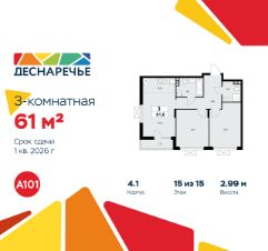 Продается трехкомнатная квартира 83 в новостройке ЖК "Деснаречье" по адресу Москва, ТиНАО, Новомосковский АО, Десеновское С/П, Десна деревня, Москва, район Троицк, ЖК Деснаречье, к. 4.1. Общая площадь квартиры - 61.00 кв. м., этаж 15 из 15, секция 1. Тип проекта, по которому построен дом - монолит, компания-застройщик - ООО "А101". Стоимость квартиры - 21811770 Р. Срок сдачи - 1 квартал 2026.