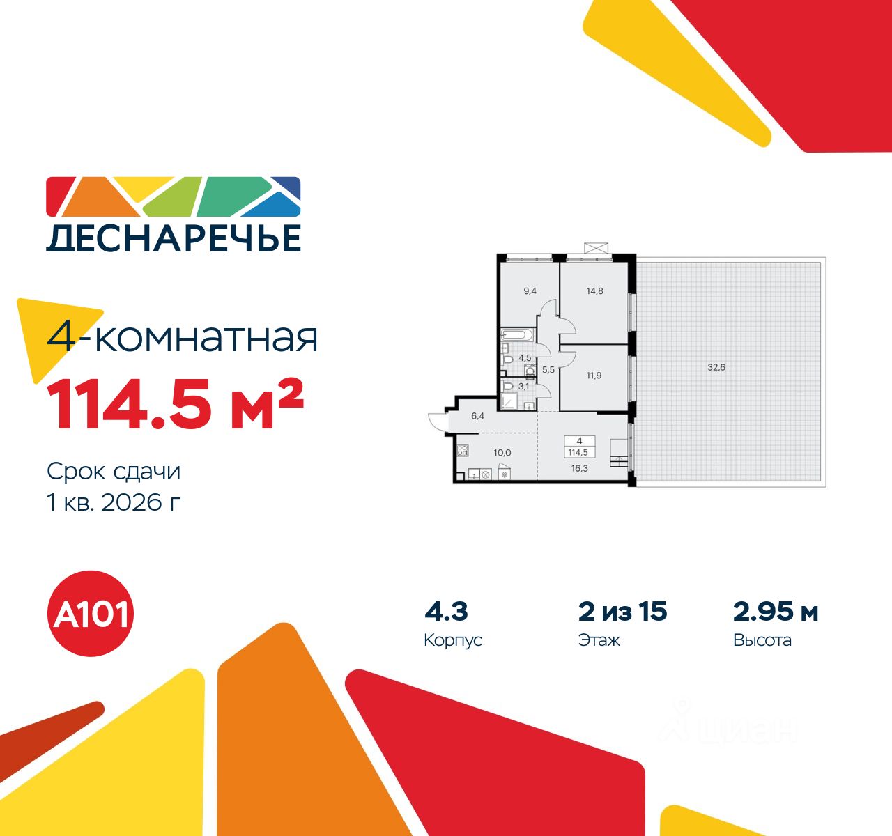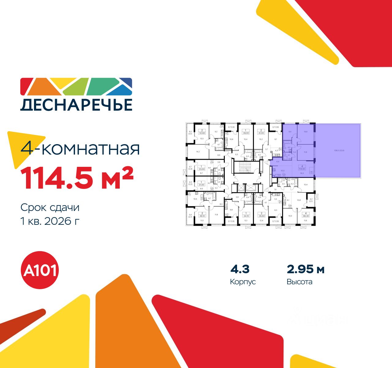 Продается четырехкомнатная квартира 584 в новостройке ЖК "Деснаречье" по адресу Москва, ТиНАО, Новомосковский АО, Десеновское С/П, Десна деревня, Москва, пос. Десёновское, д. Десна, ул. Центральная. Общая площадь квартиры - 114.50 кв. м., этаж 2 из 15, секция 9. Тип проекта, по которому построен дом - монолит, компания-застройщик - ООО "А101". Стоимость квартиры - 25683495 Р. Срок сдачи - 1 квартал 2026.