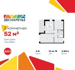 Продается двухкомнатная квартира 2140 в новостройке ЖК "Деснаречье" по адресу Москва, ТиНАО, Новомосковский АО, Десеновское С/П, Десна деревня, Москва, район Троицк, ЖК Деснаречье, к. 4.9. Общая площадь квартиры - 52.00 кв. м., этаж 14 из 15, секция 27. Тип проекта, по которому построен дом - монолит, компания-застройщик - ООО "А101". Стоимость квартиры - 22278880 Р. Срок сдачи - 1 квартал 2026.