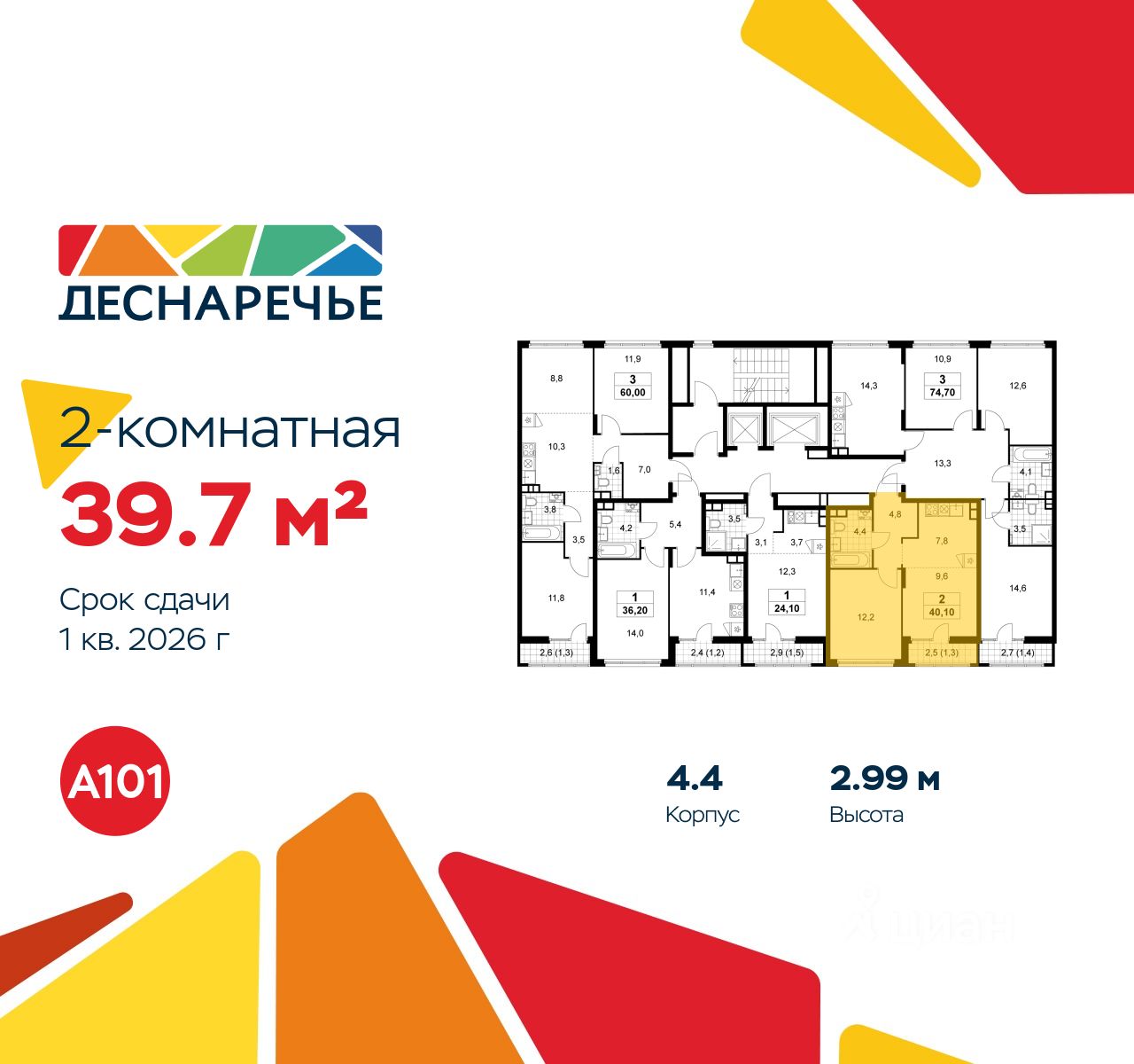 Продается двухкомнатная квартира 942 в новостройке ЖК "Деснаречье" по адресу Москва, ТиНАО, Новомосковский АО, Десеновское С/П, Десна деревня, Москва, район Троицк, ЖК Деснаречье, к. 4.4. Общая площадь квартиры - 39.70 кв. м., этаж 12 из 15, секция 12. Тип проекта, по которому построен дом - монолит, компания-застройщик - ООО "А101". Стоимость квартиры - 19591156 Р. Срок сдачи - 1 квартал 2026.