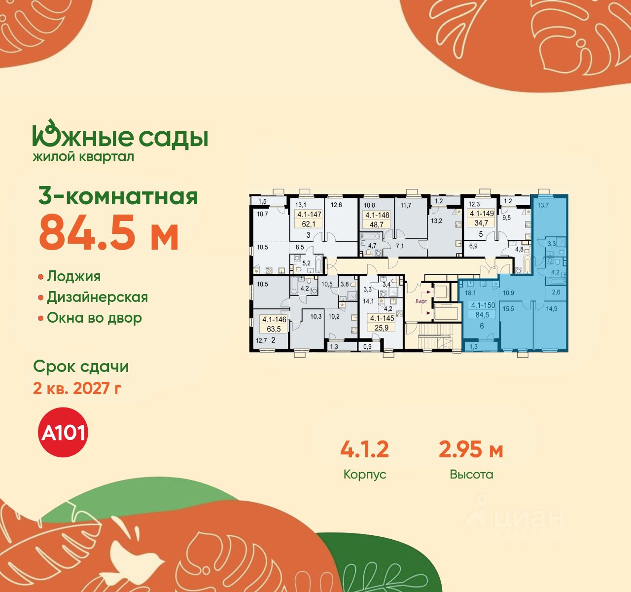 Продается трехкомнатная квартира 186 в новостройке ЖК "Южные Сады" по адресу Москва, ЮЗАО, Южное Бутово, ул. Бартеневская, д. 16. Общая площадь квартиры - 84.50 кв. м., этаж 9 из 11, секция 2. Тип проекта, по которому построен дом - монолит, компания-застройщик - ООО "А101". Стоимость квартиры - 30973475 Р. Срок сдачи - 2 квартал 2027.