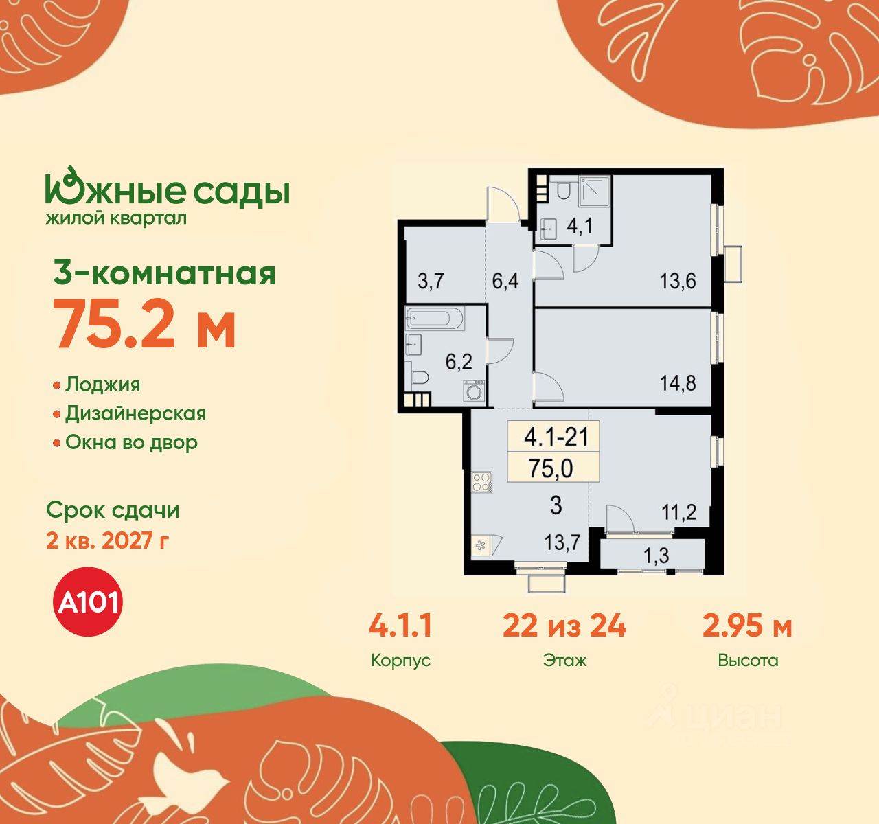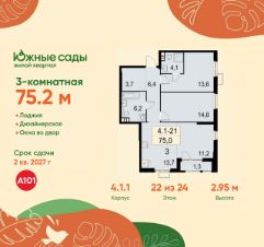 Продается трехкомнатная квартира 123 в новостройке ЖК "Южные Сады" по адресу Москва, ЮЗАО, Южное Бутово, ул. Бартеневская, д. 16. Общая площадь квартиры - 75.20 кв. м., этаж 22 из 24, секция 1. Тип проекта, по которому построен дом - монолит, компания-застройщик - ООО "А101". Стоимость квартиры - 28269184 Р. Срок сдачи - 2 квартал 2027.
