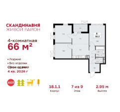 Продается четырехкомнатная квартира 34 в новостройке Жилой район "Скандинавия" по адресу Москва, ТиНАО, Новомосковский АО, Сосенское С/П, Коммунарка пос., жилой комплекс Скандинавия, 18.1.1, район Коммунарка, Новомосковский административный округ, Москва. Общая площадь квартиры - 66.00 кв. м., этаж 7 из 9, секция 1. Тип проекта, по которому построен дом - монолит, компания-застройщик - ООО "А101". Стоимость квартиры - 26147220 Р. Срок сдачи - 4 квартал 2026.