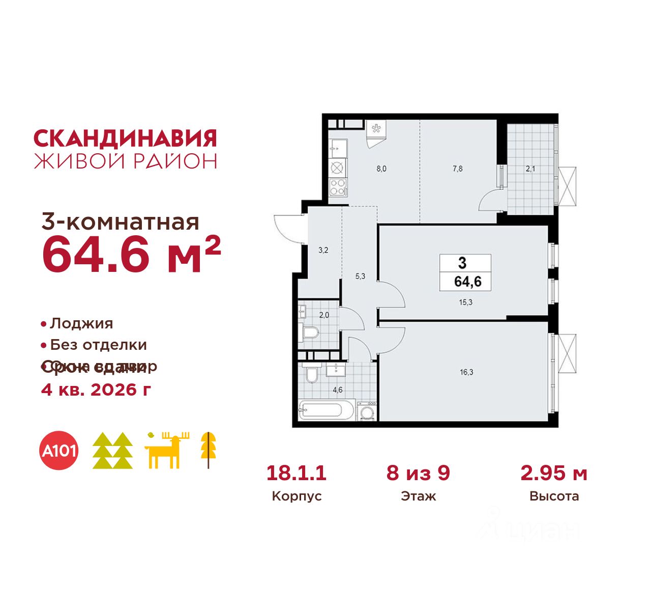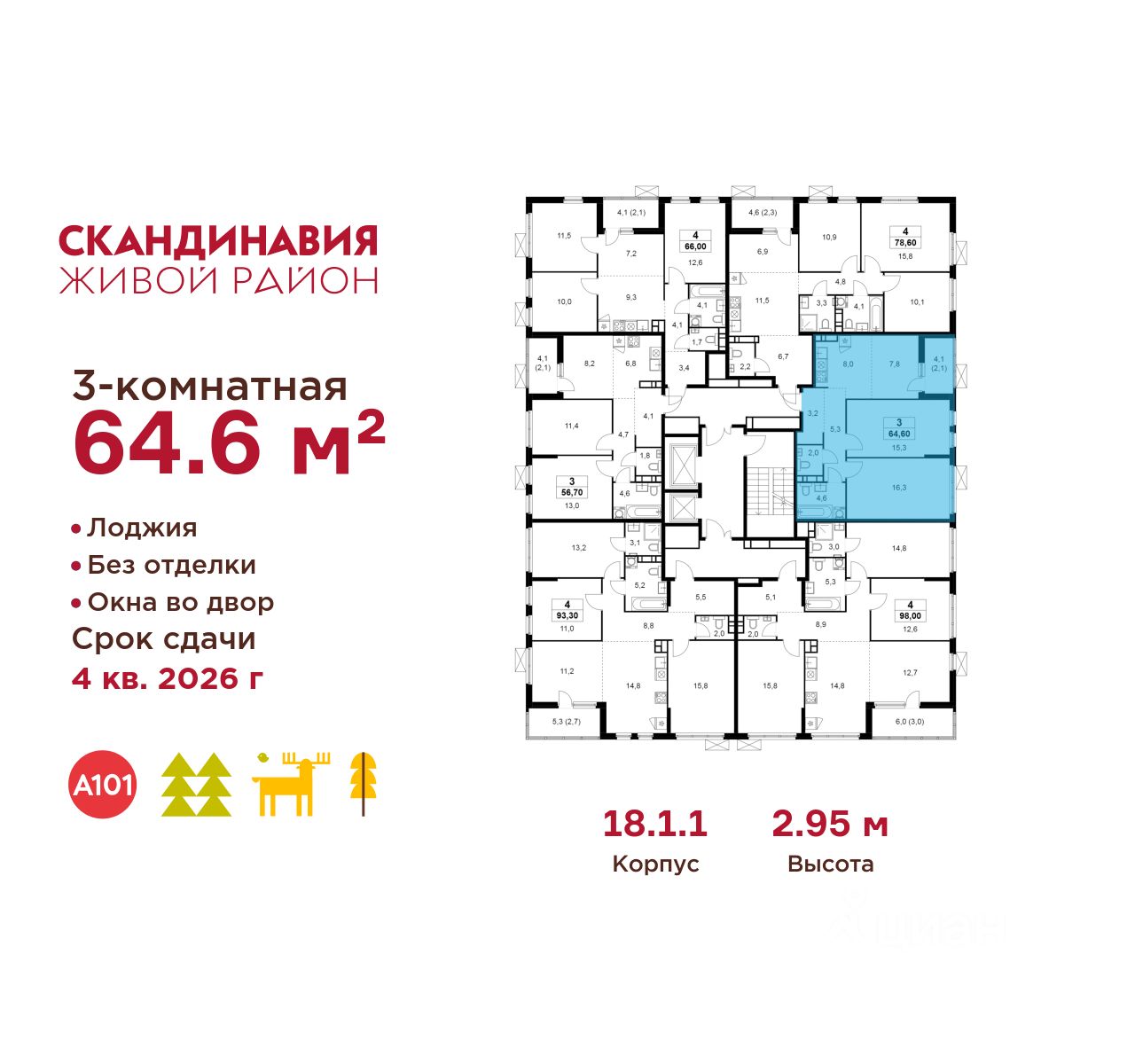 Продается трехкомнатная квартира 42 в новостройке Жилой район "Скандинавия" по адресу Москва, ТиНАО, Новомосковский АО, Сосенское С/П, Коммунарка пос., жилой комплекс Скандинавия, 18.1.1, район Коммунарка, Новомосковский административный округ, Москва. Общая площадь квартиры - 64.60 кв. м., этаж 8 из 9, секция 1. Тип проекта, по которому построен дом - монолит, компания-застройщик - ООО "А101". Стоимость квартиры - 25071260 Р. Срок сдачи - 4 квартал 2026.
