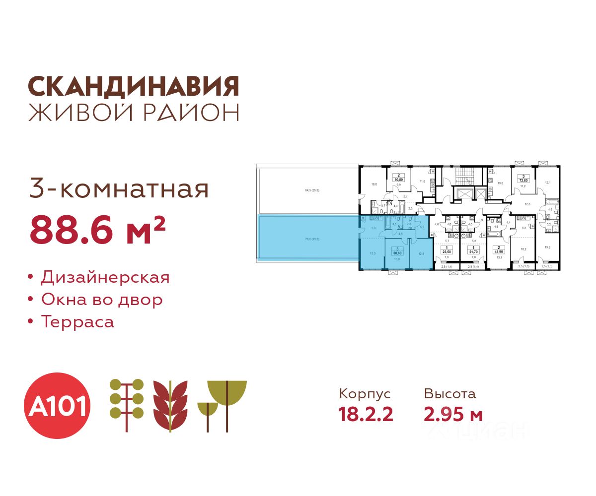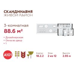 Продается трехкомнатная квартира 135 в новостройке Жилой район "Скандинавия" по адресу Москва, ТиНАО, Новомосковский АО, Сосенское С/П, Коммунарка пос., Москва, Новомосковский административный округ, район Коммунарка, ЖК Скандинавия, 18.2.2. Общая площадь квартиры - 88.60 кв. м., этаж 2 из 12, секция 3. Тип проекта, по которому построен дом - монолит, компания-застройщик - ООО "А101". Стоимость квартиры - 35465086 Р. Срок сдачи - 1 квартал 2027.