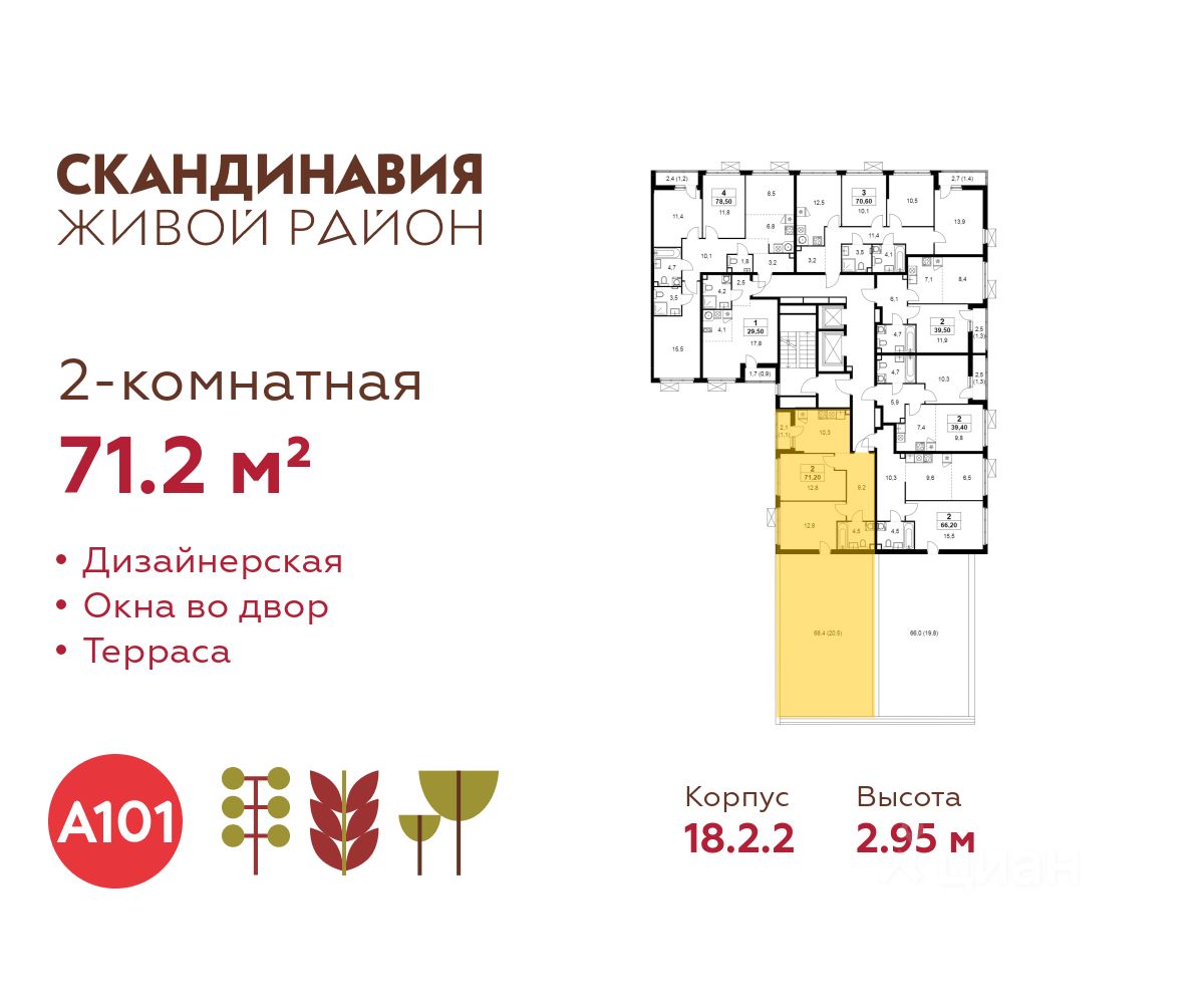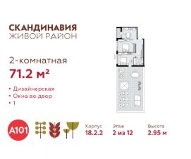 Продается двухкомнатная квартира 203 в новостройке Жилой район "Скандинавия" по адресу Москва, ТиНАО, Новомосковский АО, Коммунарка пос., Москва, Новомосковский административный округ, район Коммунарка, ЖК Скандинавия, 18.2.2. Общая площадь квартиры - 71.20 кв. м., этаж 2 из 12, секция 4. Тип проекта, по которому построен дом - монолит, компания-застройщик - ООО "А101". Стоимость квартиры - 32447058 Р. Срок сдачи - 1 квартал 2027.