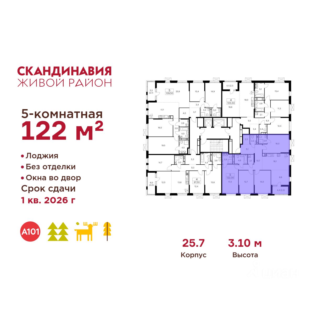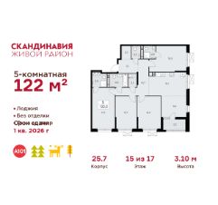 Продается многокомнатная квартира 1083 в новостройке Жилой район "Скандинавия" по адресу Москва, ТиНАО, Новомосковский АО, Сосенское С/П, Коммунарка пос., жилой комплекс Скандинавия, 25.7, район Коммунарка, Новомосковский административный округ, Москва. Общая площадь квартиры - 122.00 кв. м., этаж 15 из 17, секция 12. Тип проекта, по которому построен дом - монолит, компания-застройщик - ООО "А101". Стоимость квартиры - 45791480 Р. Срок сдачи - 2 квартал 2026.