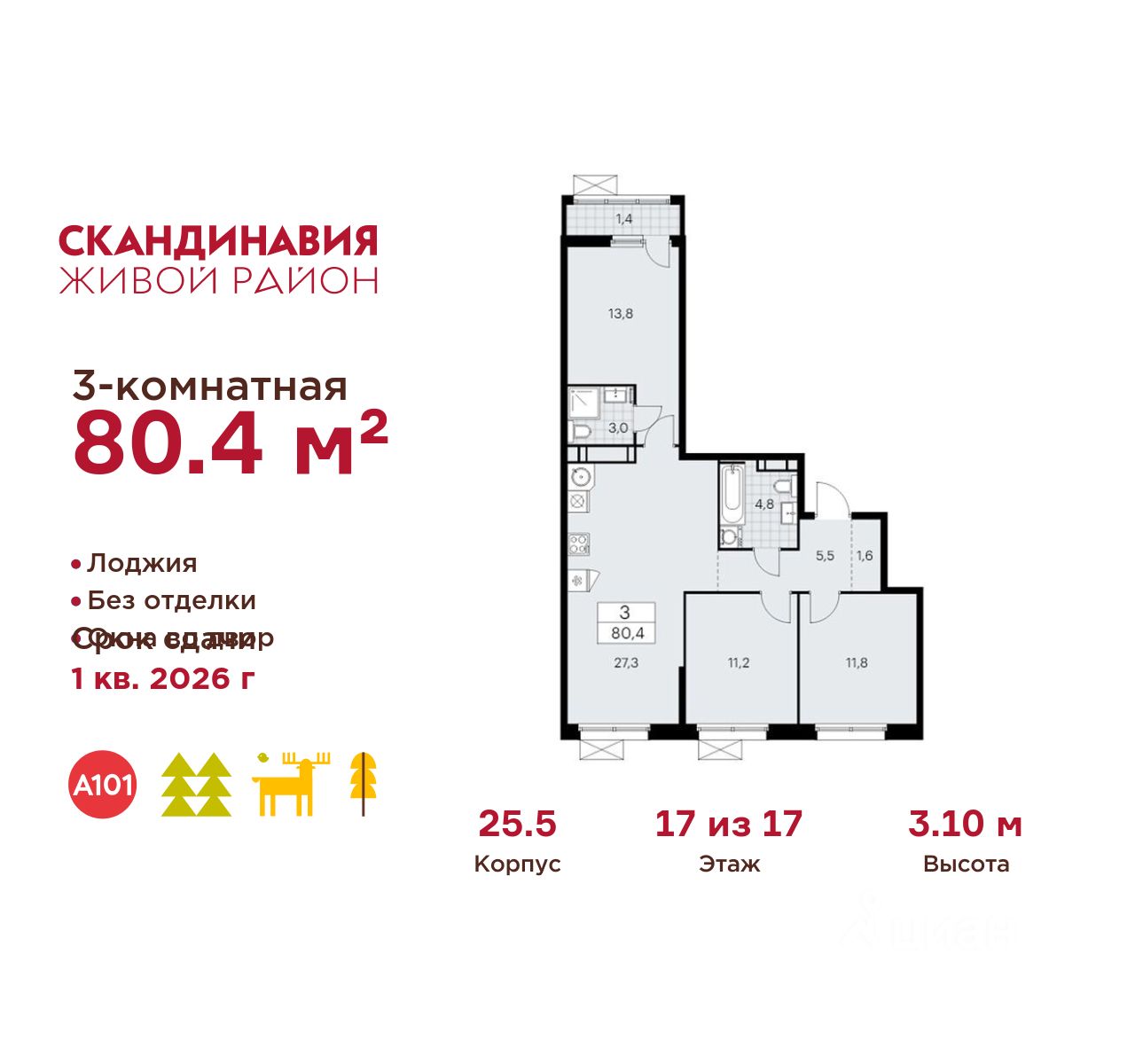 Продается трехкомнатная квартира 926 в новостройке Жилой район "Скандинавия" по адресу Москва, ТиНАО, Новомосковский АО, Сосенское С/П, Коммунарка пос., жилой комплекс Скандинавия, 25.5. Общая площадь квартиры - 80.40 кв. м., этаж 17 из 17, секция 10. Тип проекта, по которому построен дом - монолит, компания-застройщик - ООО "А101". Стоимость квартиры - 31174296 Р. Срок сдачи - 2 квартал 2026.