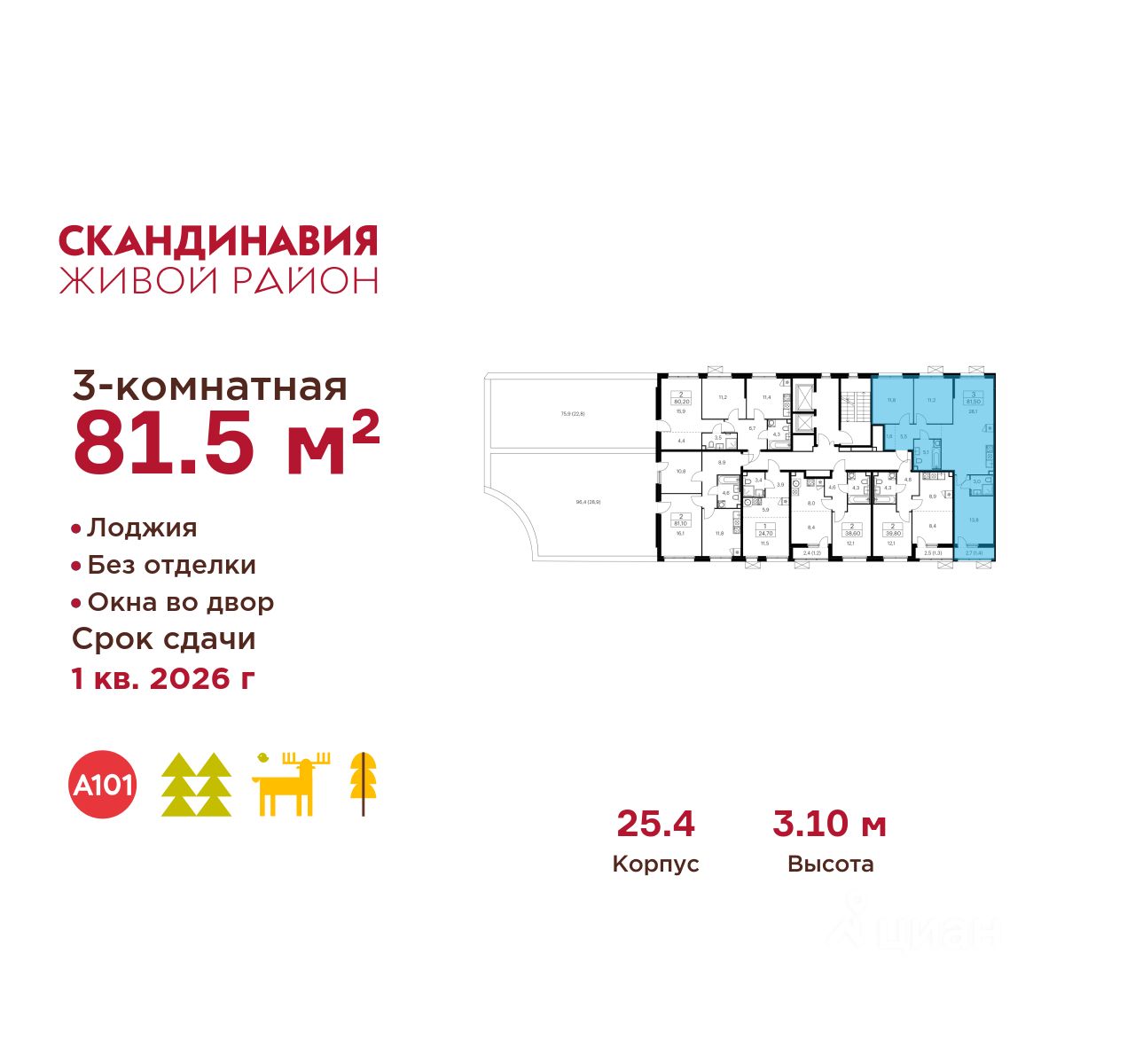 Продается трехкомнатная квартира 464 в новостройке Жилой район "Скандинавия" по адресу Москва, ТиНАО, Новомосковский АО, Сосенское С/П, Коммунарка пос., жилой комплекс Скандинавия, 25.4, район Коммунарка, Новомосковский административный округ, Москва. Общая площадь квартиры - 81.50 кв. м., этаж 2 из 13, секция 4. Тип проекта, по которому построен дом - монолит, компания-застройщик - ООО "А101". Стоимость квартиры - 28220190 Р. Срок сдачи - 2 квартал 2026.
