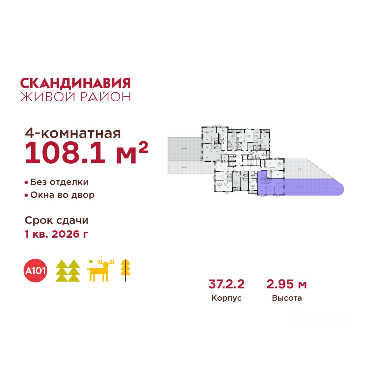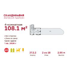 Продается четырехкомнатная квартира 189 в новостройке Жилой район "Скандинавия" по адресу Москва, ТиНАО, Новомосковский АО, Сосенское С/П, Коммунарка пос., жилой комплекс Скандинавия, 37.2.2. Общая площадь квартиры - 108.10 кв. м., этаж 2 из 18, секция 2. Тип проекта, по которому построен дом - монолит, компания-застройщик - ООО "А101". Стоимость квартиры - 33059142 Р. Срок сдачи - 1 квартал 2026.