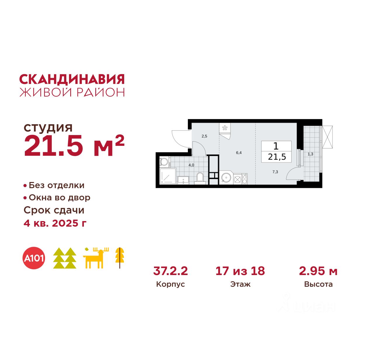 Продается студия 363 в новостройке Жилой район "Скандинавия" по адресу Москва, ТиНАО, Новомосковский АО, Сосенское С/П, Коммунарка пос., жилой комплекс Скандинавия, 37.2.2. Общая площадь квартиры - 21.50 кв. м., этаж 17 из 18, секция 2. Тип проекта, по которому построен дом - монолит, компания-застройщик - ООО "А101". Стоимость квартиры - 13179715 Р. Срок сдачи - 1 квартал 2026.