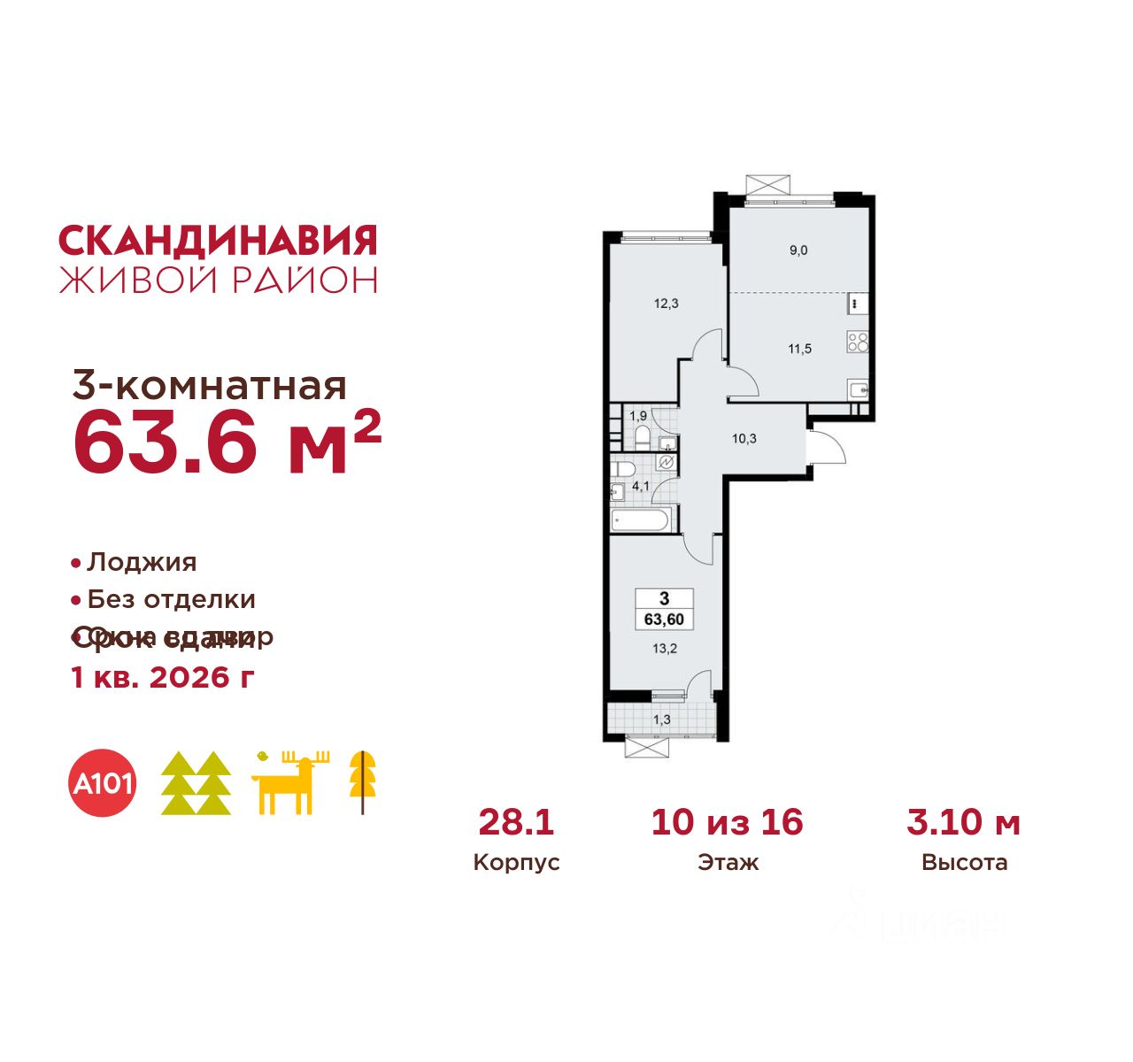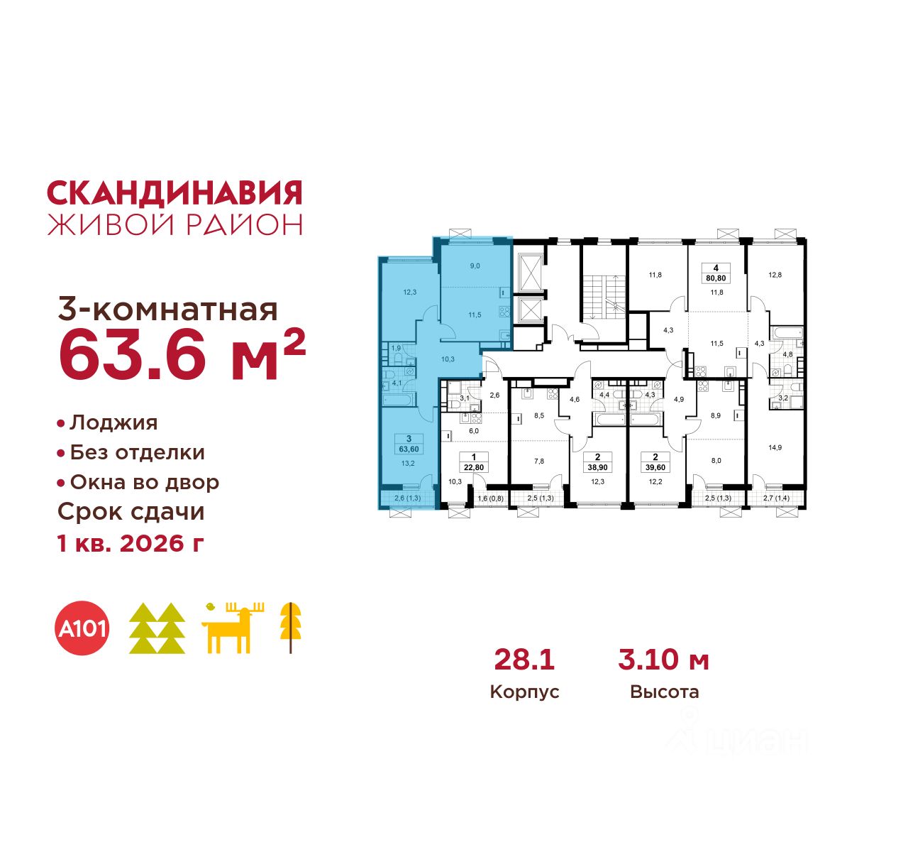 Продается трехкомнатная квартира 135 в новостройке Жилой район "Скандинавия" по адресу Москва, ТиНАО, Новомосковский АО, Сосенское С/П, Коммунарка пос., жилой комплекс Скандинавия, 28.1, район Коммунарка, Новомосковский административный округ, Москва. Общая площадь квартиры - 63.60 кв. м., этаж 10 из 16, секция 2. Тип проекта, по которому построен дом - монолит, компания-застройщик - ООО "А101". Стоимость квартиры - 25604724 Р.
