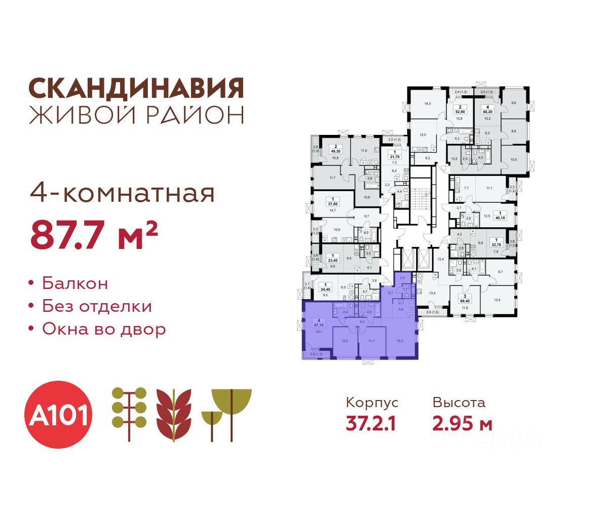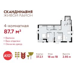 Продается четырехкомнатная квартира 182 в новостройке Жилой район "Скандинавия" по адресу Москва, ТиНАО, Новомосковский АО, Коммунарка пос., жилой комплекс Скандинавия, 37.2.1. Общая площадь квартиры - 87.70 кв. м., этаж 18 из 18, секция 1. Тип проекта, по которому построен дом - монолит, компания-застройщик - ООО "А101". Стоимость квартиры - 36295522 Р. Срок сдачи - 2 квартал 2026.