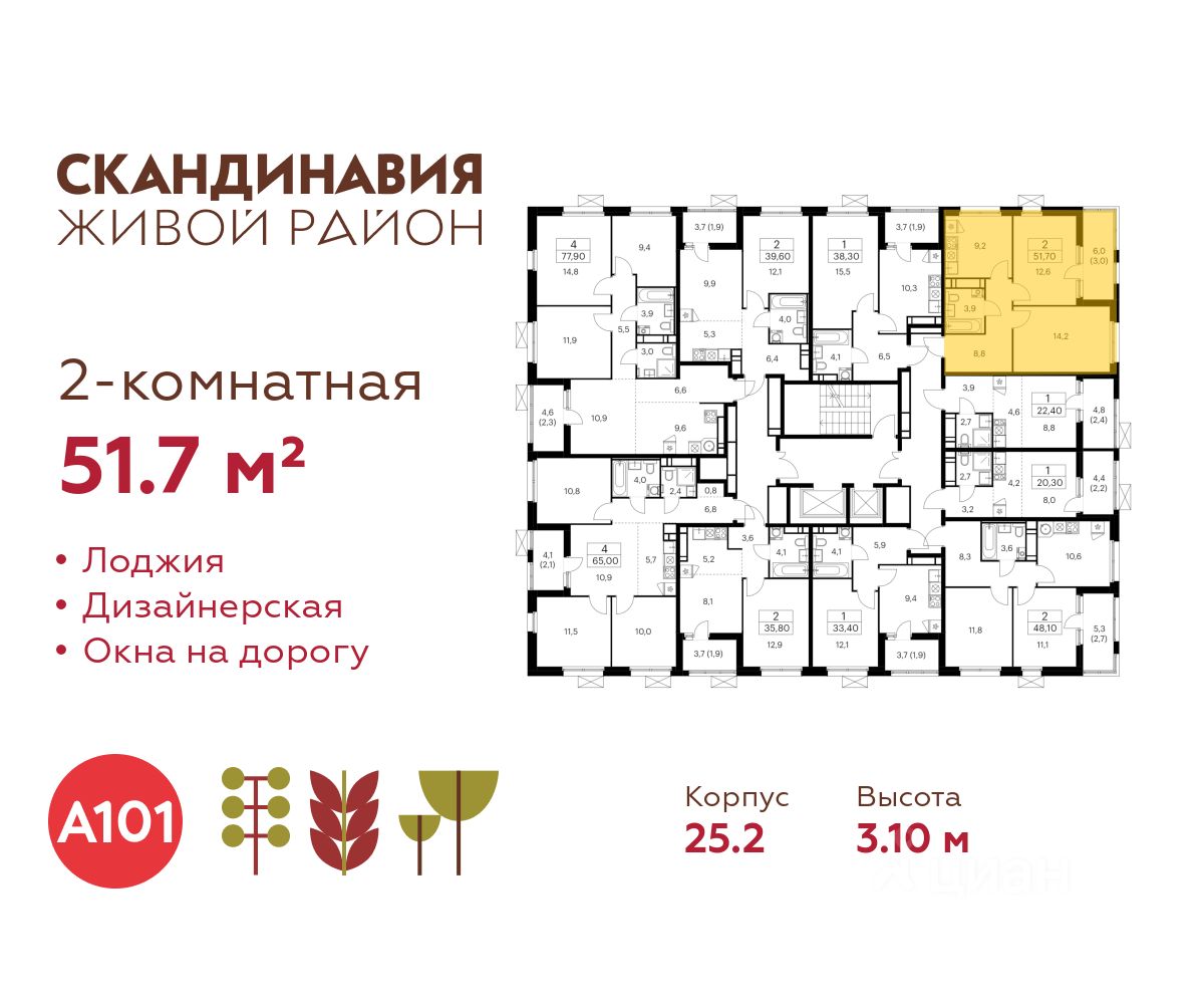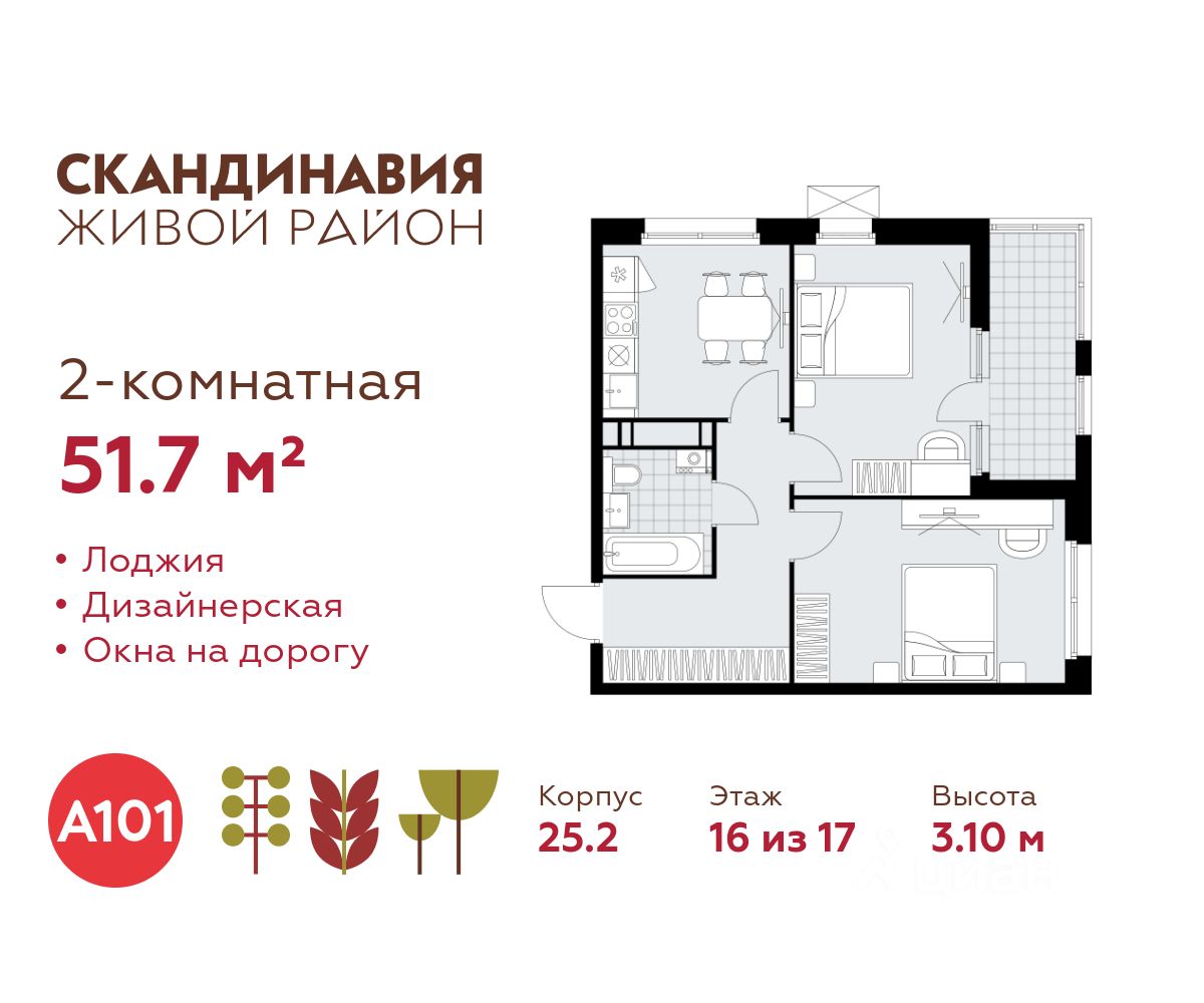 Продается двухкомнатная квартира 285 в новостройке Жилой район "Скандинавия" по адресу Москва, ТиНАО, Новомосковский АО, Коммунарка пос., жилой комплекс Скандинавия, 25.2, район Коммунарка, Новомосковский административный округ, Москва. Общая площадь квартиры - 51.70 кв. м., этаж 16 из 17, секция 2. Тип проекта, по которому построен дом - монолит, компания-застройщик - ООО "А101". Стоимость квартиры - 27021005 Р. Срок сдачи - 2 квартал 2026.