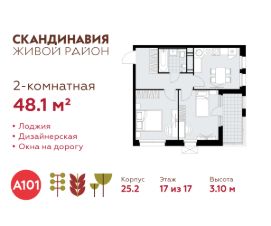 Продается двухкомнатная квартира 298 в новостройке Жилой район "Скандинавия" по адресу Москва, ТиНАО, Новомосковский АО, Коммунарка пос., жилой комплекс Скандинавия, 25.2, район Коммунарка, Новомосковский административный округ, Москва. Общая площадь квартиры - 48.10 кв. м., этаж 17 из 17, секция 2. Тип проекта, по которому построен дом - монолит, компания-застройщик - ООО "А101". Стоимость квартиры - 26555048 Р. Срок сдачи - 2 квартал 2026.