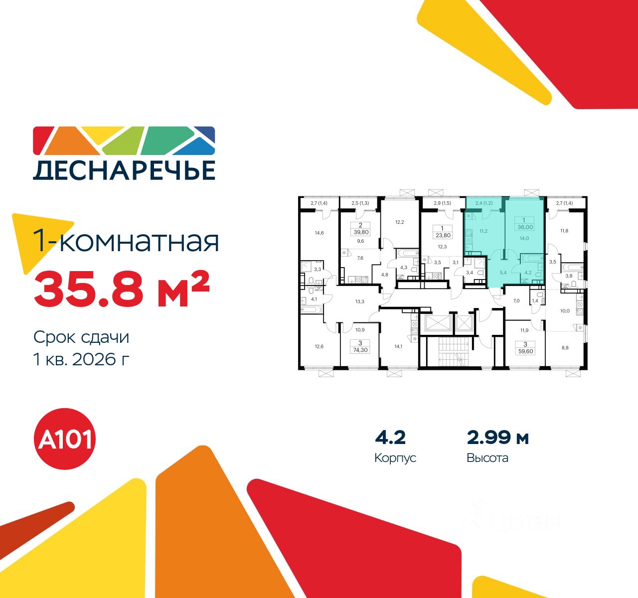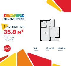Продается однокомнатная квартира 425 в новостройке ЖК "Деснаречье" по адресу Москва, ТиНАО, Новомосковский АО, Десеновское С/П, Десна деревня, Москва, район Троицк, ЖК Деснаречье, к. 4.2. Общая площадь квартиры - 35.80 кв. м., этаж 15 из 16, секция 5. Тип проекта, по которому построен дом - монолит, компания-застройщик - ООО "А101". Стоимость квартиры - 15177768 Р. Срок сдачи - 1 квартал 2026.