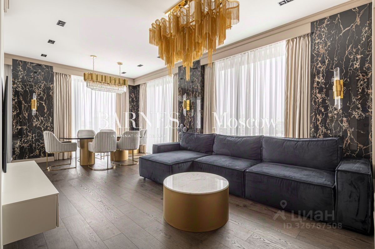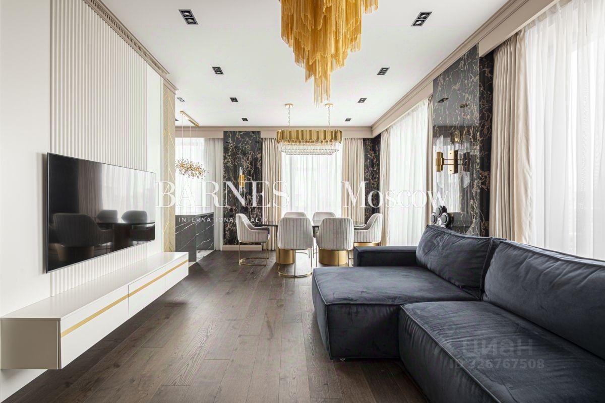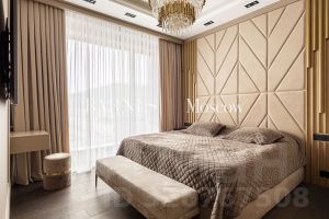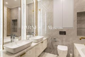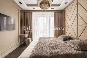 В квартире выполнена авторская отделка в стиле современной классики. Планировочным решением предусмотрены: просторная гостиная-столовая с зоной кухни, мастер-блок с кабинетом, гардеробной и ванной комнатой, детская спальня, санузел, прихожая с гардеробной.