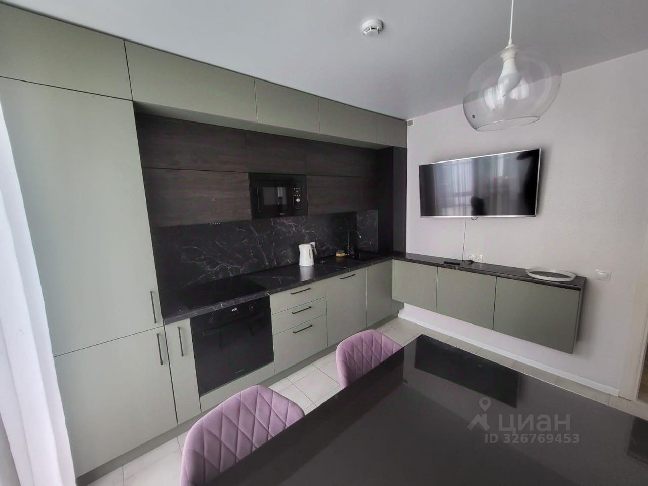 В гостиной установлен кухонный гарнитур с встроенным холодильником, варочной панелью, духовым шкафом, микроволновой печью и вытяжкой, телевизор, стол, 4 стула и диван.