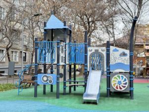 Обновленная детская площадка, спортивная площадка для баскетбола и футбола.