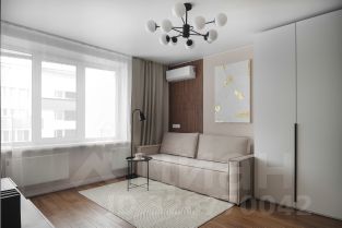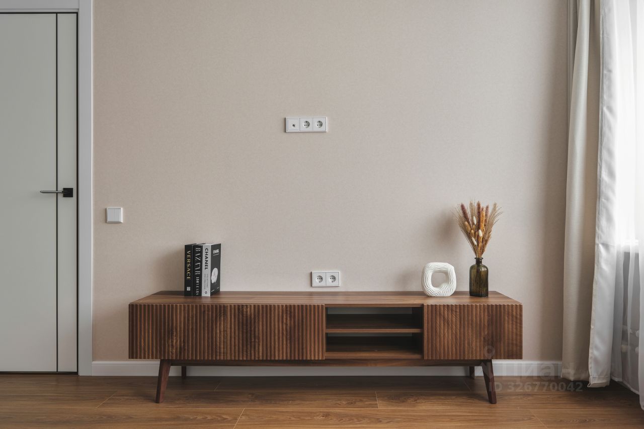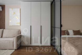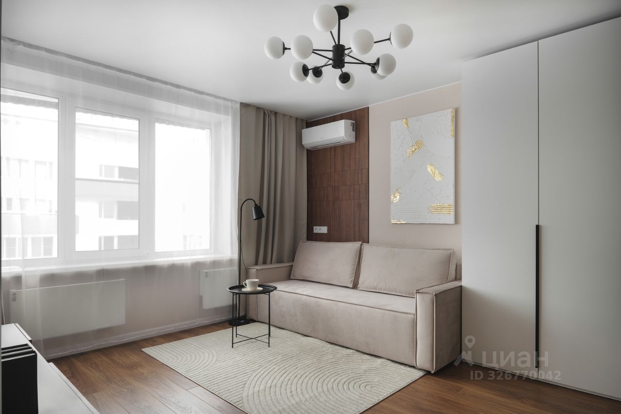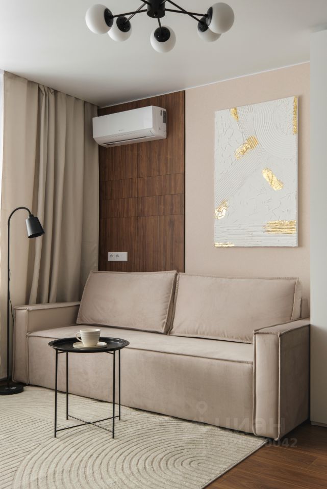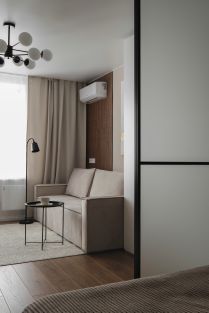 Элегантный раскладной диван, вместительные шкафы, ТВ-зона, кондиционер, продуманное освещение. Пространство подходит как для отдыха, так и для приёма гостей.