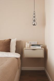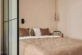 Кровать с подъёмным механизмом (дополнительное хранение), лаконичная тумба, мягкая подсветка, проходные выключатели — внимание к деталям, которое ощущается ежедневно.