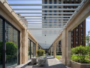 Приватная территория "Интонации" разделена на две тематические зоны: внутренний двор с детскими и спортивными площадками и ландшафтный сад на террасе. Главным акцентом стал парящий водоем с подвижной гладью.