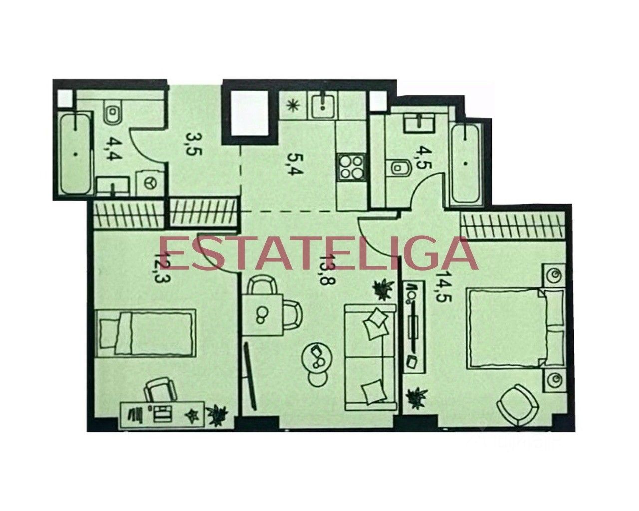 Свободная планировка, включает в себя: кухню и гостиную, которую можно совместить и получится большая зона отдыха для всей семьи. 1 изолированная комната - детская или кабинет, изолированная мастер - спальня с санузлом и 1 гостевой санузел при входе в квартиру.