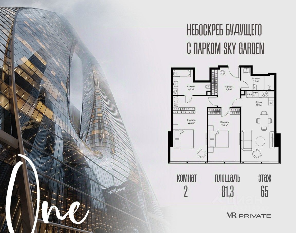 В продаже 2-комнатная квартира площадью 81.30 м² на 65-м этаже.