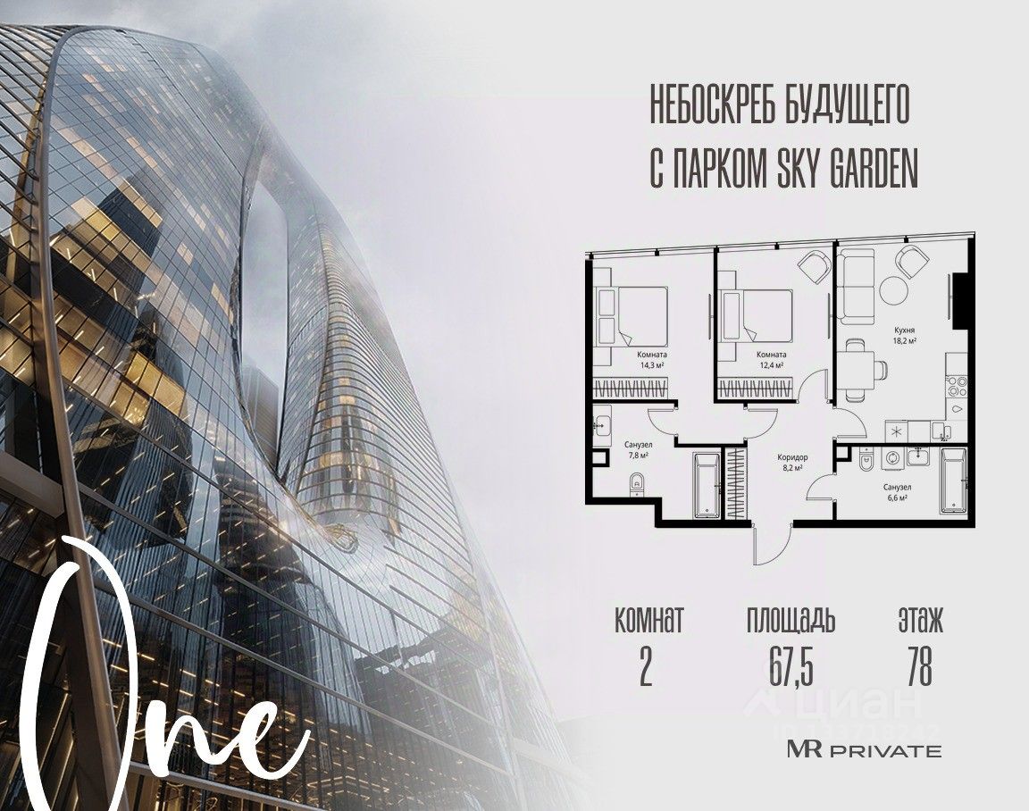 В продаже 2-комнатная квартира площадью 67.50 м² на 78-м этаже.