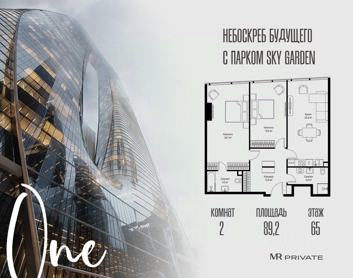 В продаже 2-комнатная квартира площадью 89.20 м² на 65-м этаже.