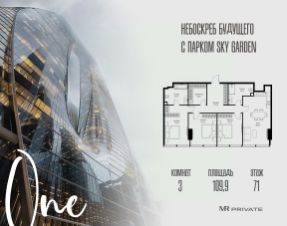 В продаже 3-комнатная квартира площадью 109.90 м² на 71-м этаже.