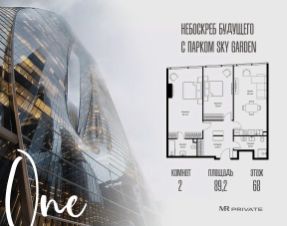 В продаже 2-комнатная квартира площадью 89.20 м² на 68-м этаже.