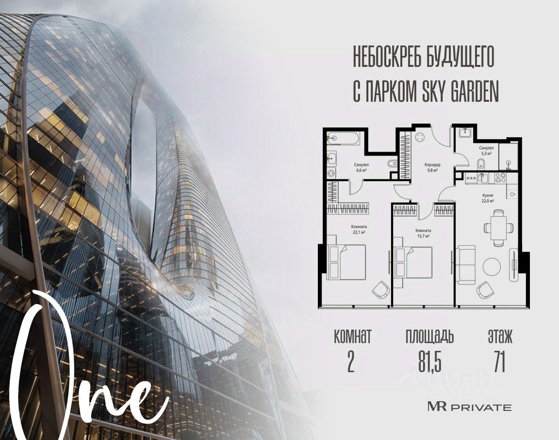 В продаже 2-комнатная квартира площадью 81.50 м² на 71-м этаже.