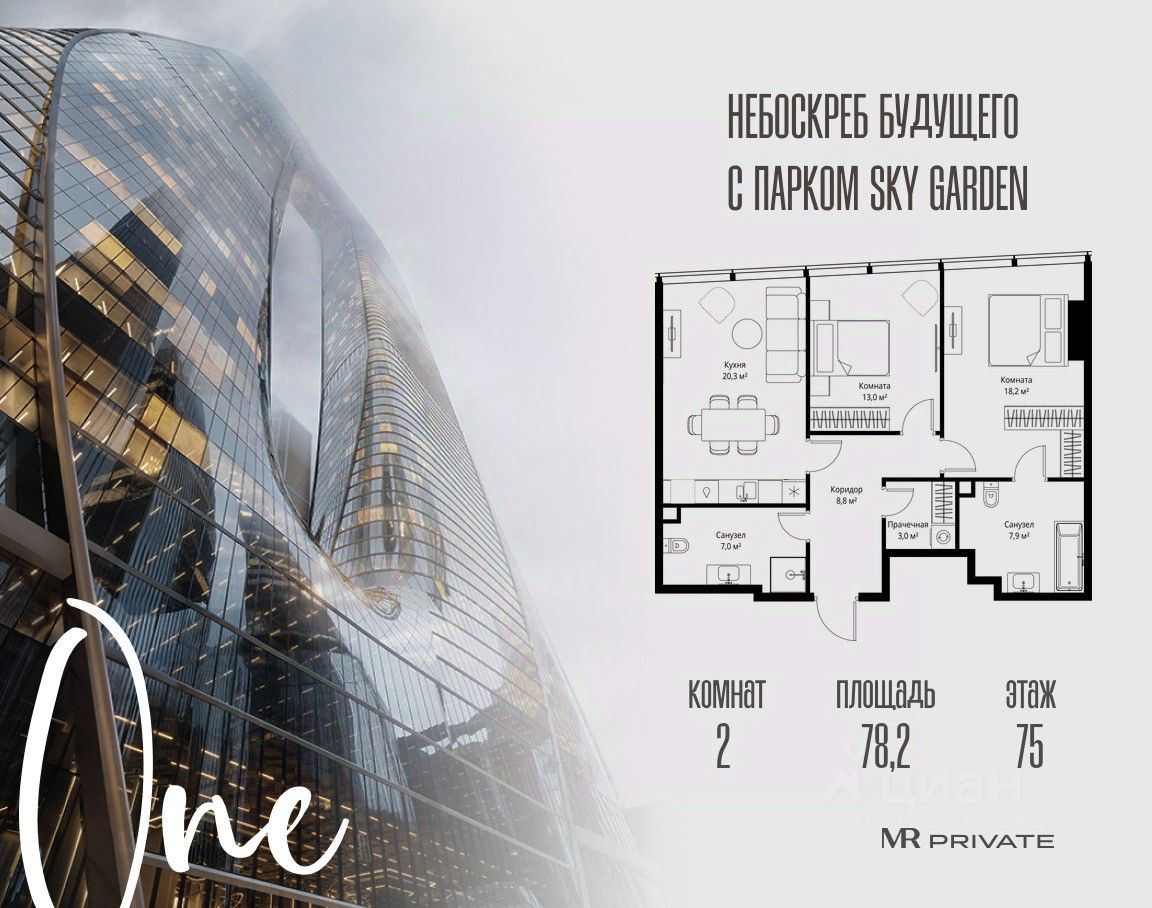 В продаже 2-комнатная квартира площадью 78.20 м² на 75-м этаже.