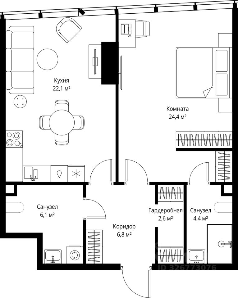 В продаже 1-комнатная квартира площадью 66.40 м² на 75-м этаже.