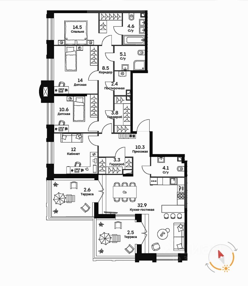 Общая площадь 131.2 кв.м., Корпус 1, Секция 1, Этаж 26 из 27, ИДН 263, Потолки 3.3 м., Панорамный вид на Москву реку. Две террасы. Площадь кухни-гостиной 32.9 кв.м., срок сдачи 3 квартал 2026 года.