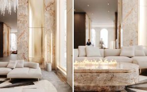 Проект выделяют роскошь премиальных отделочных материалов, обилие декоративных элементов, растительных орнаментов и геометрических паттернов на фасадах, а так же геометрическая выверенность французских балконов и арочных окон.