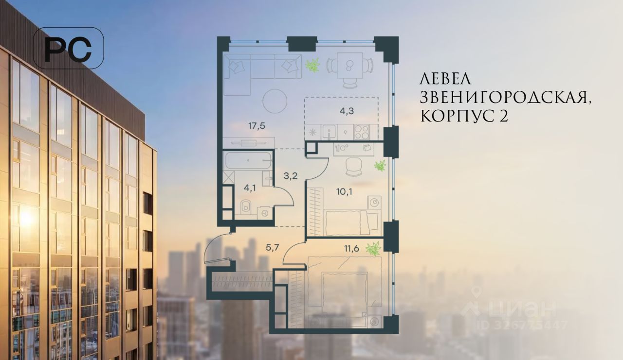 Видовая, солнечная 3-комнатная квартира 56,5 м² в ЖК Level Звенигородская (этап 1)
