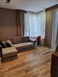 Общая площадь квартиры 35 кв. м., комната 16 кв.м., кухня 10 кв. м. Сделан качественный ремонт с использованием дорогих строительных и отделочных материалов по индивидуальному дизайн - проекту. Грамотная инженерия. Высокие потолки 3.20 м. Квартира находится на 13 этаже 23- этажного дома. В комнате большие окна, благодаря которым в квартире всегда светло. Ванная комната с окном, также есть система фильтрации и электрический бойлер на случай отключения горячей воды. Установлен кондиционер в комнате. Остается встроенная кухня со встроенной техникой, холодильник и практически вся мебель.