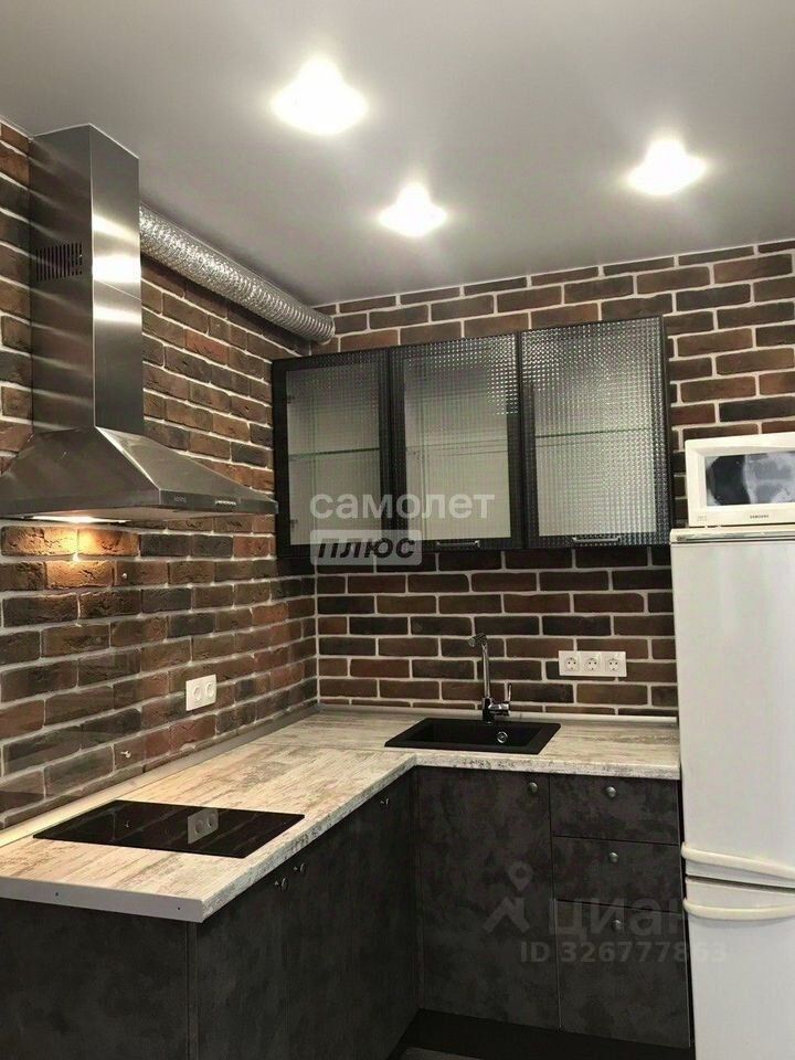 Кухня (9 м²): Стильная отделка с кирпичными акцентами. Встроенная техника: холодильник, посудомоечная машина. Есть обеденная группа (стол + стулья).