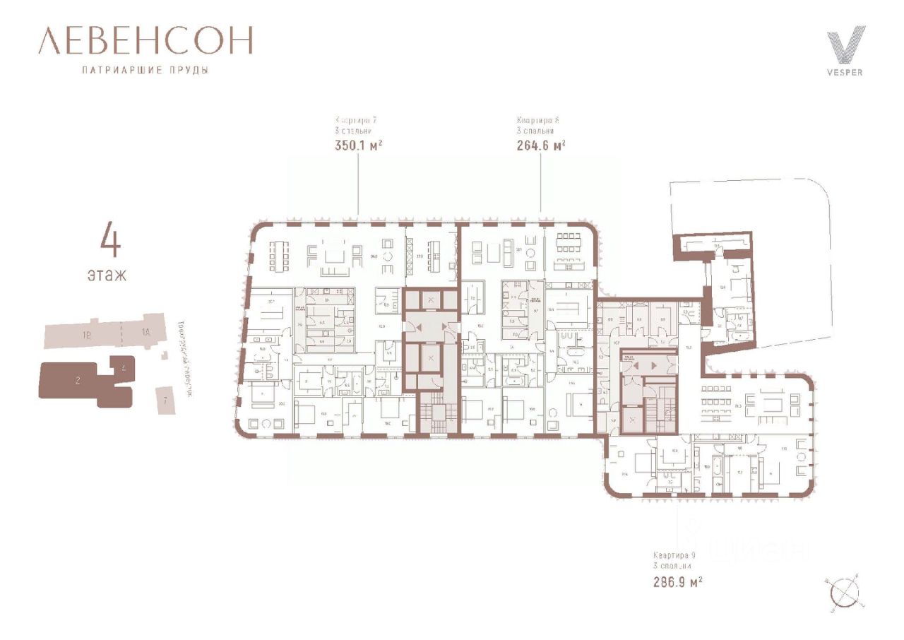 Продается квартира с премиальной отделкой на 4-м этаже общей площадью 350,1 кв.м. с 3-мя спальнями и кухней-гостиной