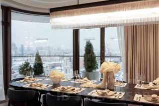 Единственная квартира в доме с отделкой и мебелью, её площадь 201,5 кв. м. Дизайн пространства разработало международное архитектурное бюро Олега Клодта. Продуманная планировка разделена на две зоны. В парадной части расположена кухня-гостиная площадью 85 кв. м, гостевой санузлел и прихожая, а в приватной - три спальни. Из панорамных окон просторной кухни-гостиной открываются впечатляющие прямые виды на Кремль, храм Христа Спасителя и Москва-Сити. Панорамные окна спален выходят в тихий приватный двор-парк с живописным ландшафтным дизайном, фонтаном и ручьём. В каждой спальне свой санузел и гардеробная.