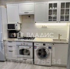 Встроенная кухня с полным комплектом техники (холодильник, стиральная машина, газовая панель, духовой шкаф, микроволновка, кондиционер), угловой диван, двухспальная кровать, шкаф-витрина, тумба, прихожая. Вся мебель и техника — новые, покупались специально для этой квартиры.