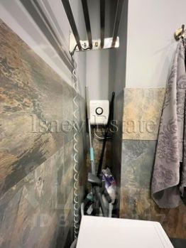 • Мебель и техника: стиральная машина, водонагреватель, душевая кабина, вешалка для одежды, большой встроенный шкаф, диван-кровать, кондиционер, два рабочих стола, кухня с индукционной плитой и духовкой-микроволновкой, кухонный стол, холодильник, сетевые розетки.