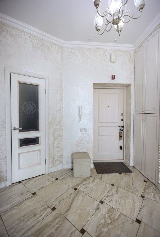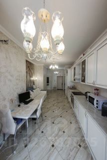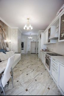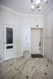 В квартире выполнен качественный ремонт с использованием дорогих качественных материалов. Керамогранитные полы с подогревом в прихожей, на кухне и ванной. Бесшовная отделка стен, венецианская штукатурка. На кухне представлена фреска Боттичелли. Есть гардеробная и просторный санузел (7.2 метра) с плиткой и сантехникой из Италии.