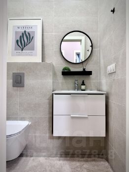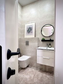 Совмещенный просторный санузел оборудован инсталляцией и сантехникой Grohe, раковина и плитка - Kerama Marazzi.