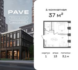 Продается 1-к. квартира квартира номер 123 общей площадью 37 кв.м. на 13-м этаже 33 этажного дома, 1. Без отделки.